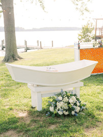 This chic, waterfront welcome party at Brittland Estates was perfection! The weather was perfect for the al fresco affair, that saw the cutest Orange Crush bar displaying the couple's signature drinks! Other favorites touches included lots of blue hydrangeas, coastal blues, a duck groom's cake, and a nod to the couple's pups. Photos by Kir Tuben, catering by Spilled Milk, florals by Bloomin' Wild, and rentals from Pretty Little Wedding Co, Eastern Shore Tents and BBJ LaTavola. Stationery and "The Night Before" logo designed by chez la mariee.