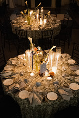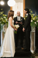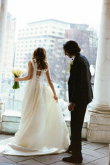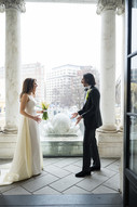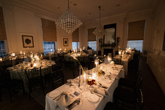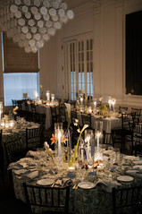 Rebecca and Kevin live in Washington, DC, and found their perfect venue at Patterson Mansion in the heart of Dupont Circle. Rebecca loved the venue's historical charm paired with funky artwork. For their wedding day, they envisioned an intimate, modern style of dinner party with lots of dancing. As guests arrived, they were greeted with champagne and the sounds of a violinist. The ceremony was unique as it was a standing ceremony. The violinist led the way for the groom and wedding party as the guests followed into the study with the altar situated against the fireplace. Rebecca then ascended the beautiful staircase and made her way down the aisle. After the ceremony, guests enjoyed cocktail hour and then were welcomed into the stunning ballroom. With all the lights dimmed, the flickering candles provided the ambiance for the dinner portion of the evening. After dinner, guests dance the night away on the checkerboard dance floor -- a fun surprise was the shotski that made an appearance into the night! As guests departed, a warm chocolate chip was awaiting them to take!